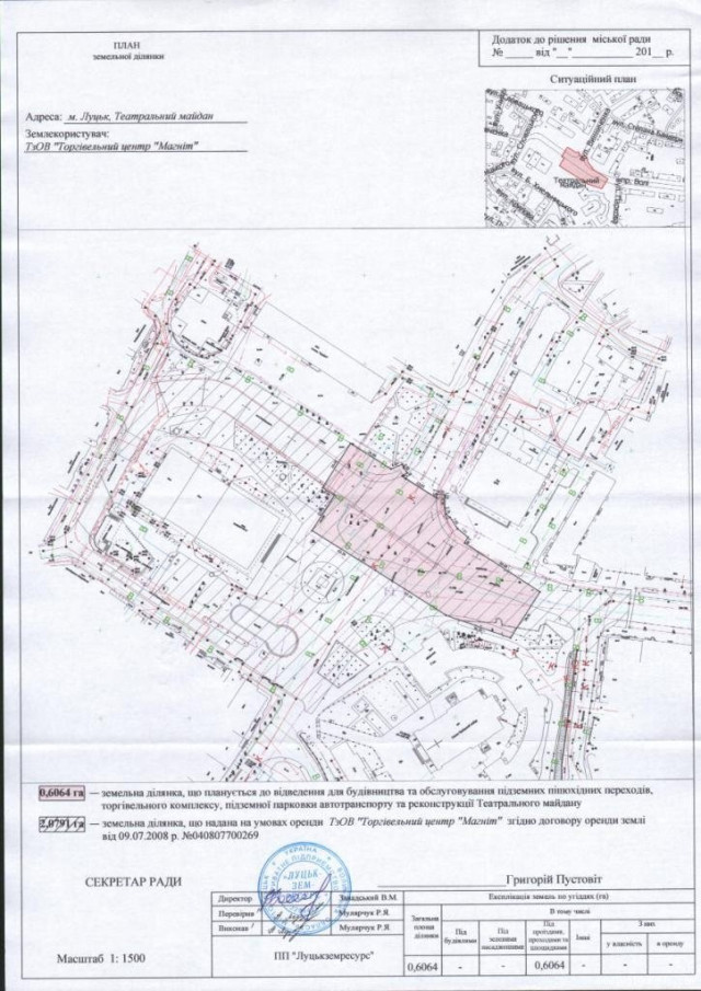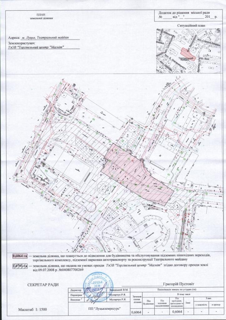 Власне, у Луцькій міськраді зареєстрували проект рішення про надання ТОВ «ТЦ «Магніт» дозволу на розроблення проекту землеустрою щодо відведення земельної ділянки для будівництва та обслуговування підземних пішохідних переходів, торгівельного комплексу, підземної парковки автотранспорту та реконструкції Театрального майдану.