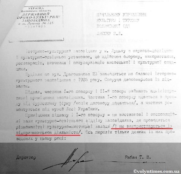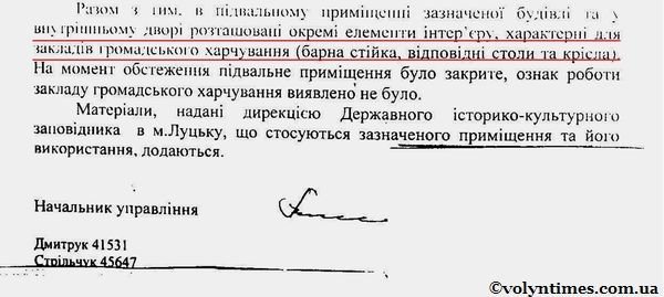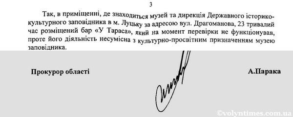 У прокурорській відповіді, зокрема, йдеться: «В приміщенні, де знаходиться музей та дирекція Державного історико-культурного заповідника в м. Луцьку за адресою Драгоманова, 23 тривалий час був розміщений бар, який на момент перевірки не функціонував, проте його діяльність несумісна з культурно-просвітним призначенням музею заповідника».