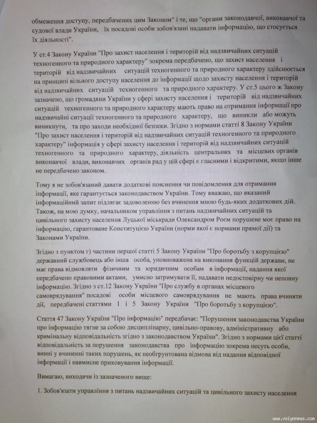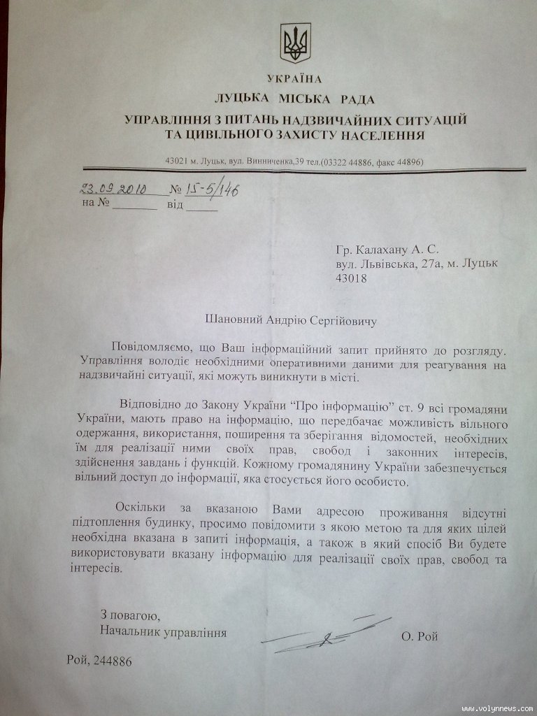 За словами члена Луцького міського комітету ВО «Свобода», натомість він отримав «відписку» від начальника управління Олександра Роя, у якій ішлося: «Оскільки за вказаною Вами адресою проживання відсутні підтоплення будинку, просимо повідомити з якою метою та для яких цілей необхідна вказана в запиті інформація, а також в який спосіб Ви будете використовувати вказану інформацію для реалізації своїх прав, свобод та інтересів».