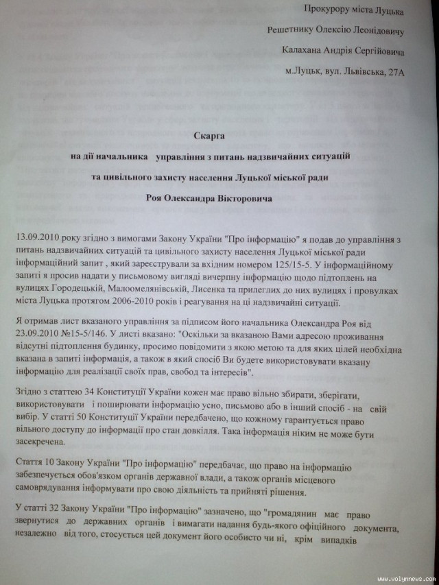 Член Луцького міського комітету Всеукраїнського об'єднання «Свобода» Андрій Калахан 29 вересня звернувся в прокуратуру міста Луцька, аби та зобов’язала посадовця Луцької мерії надати йому інформацію про підтоплення житлових будинків.