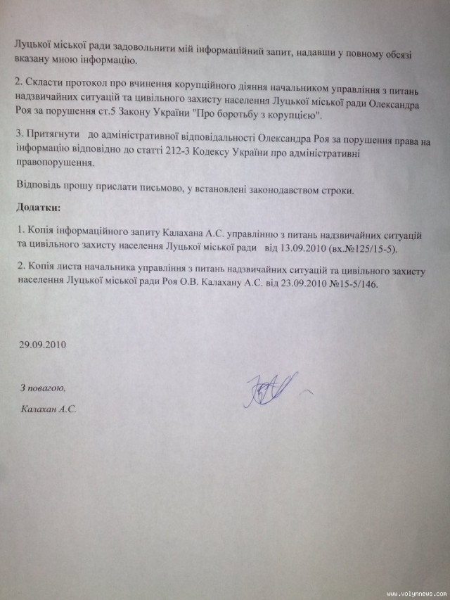 Тому він подав скаргу прокурору міста Луцька Олексію Решетнику, де вимагає зобов'язати управління з питань надзвичайних ситуацій та цивільного захисту населення мерії надати інформацію, про яку йдеться у запиті. Також Андрій Калахан хоче, щоб прокуратура склала протокол про корупційне діяння Олександра Роя і, відповідно, притягнула його до відповідальності.