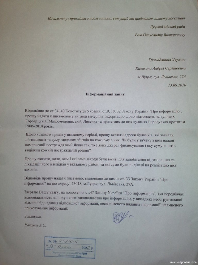 «13 вересня я особисто подав інформаційний запит з приводу цієї проблеми в управління з питань надзвичайних ситуацій та цивільного захисту населення Луцької міськради. Я просив надати мені вичерпну інформацію щодо підтоплень у вказаному районі протягом 2006-2010 років: збитки та компенсації родинам, заходи, які вживалися для запобігання підтопленню і ліквідації його наслідків...», - розповів Андрій Калахан.