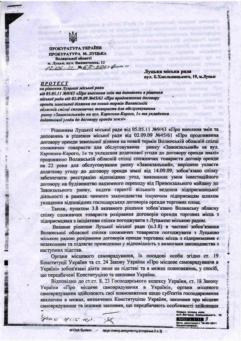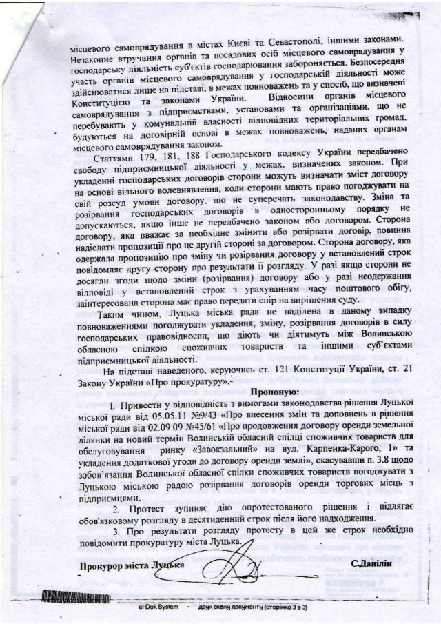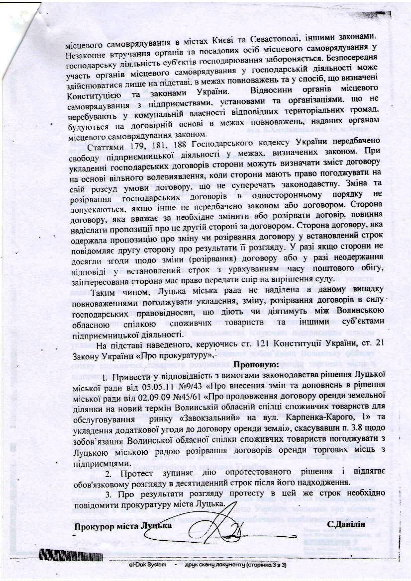 Як йдеться у протесті прокурора, підписаному прокурором міста Луцька Сергієм Даніліним, прокуратура опротестувала пункт 3.8 рішення ради. Цим пунктом рада зобов’язала облспоживспілку погоджувати з радою розірвання договорів оренди торгових місць з підприємцями, якщо таке розірвання відбувається з ініціативи спілки.