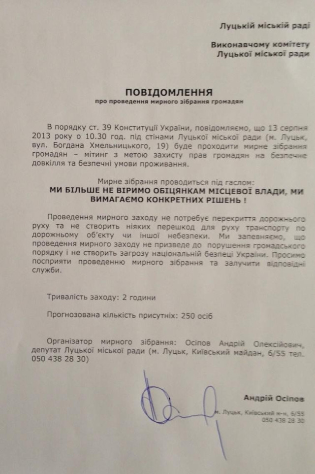 Про це Волинським Новинам повідомив організатор мітингу - депутат міськради Андрій Осіпов.