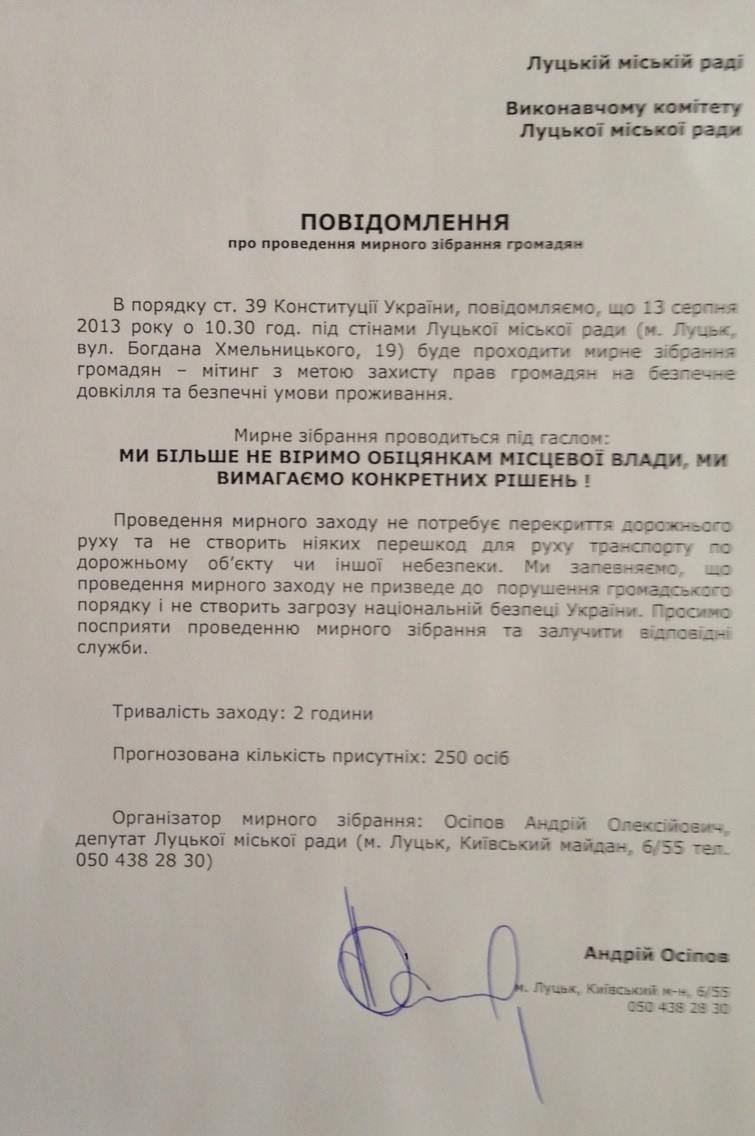 Про це Волинським Новинам повідомив організатор мітингу - депутат міськради Андрій Осіпов.