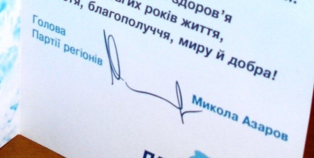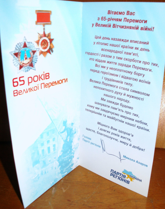 Сьогодні перед урочистим зібранням Волинської обласної організації інвалідів війни та Збройних Сил з нагоди Дня Перемоги у гімназії №4 імені Модеста Левицького роздавали вітальні листівки від голови Партії Регіонів Миколи Азарова.