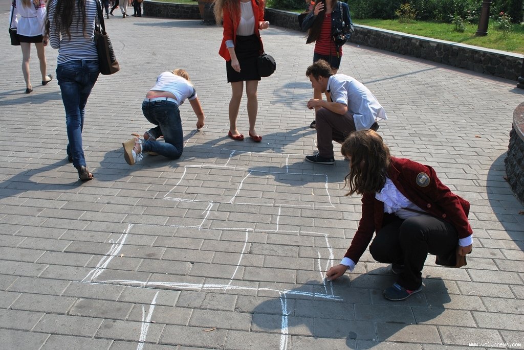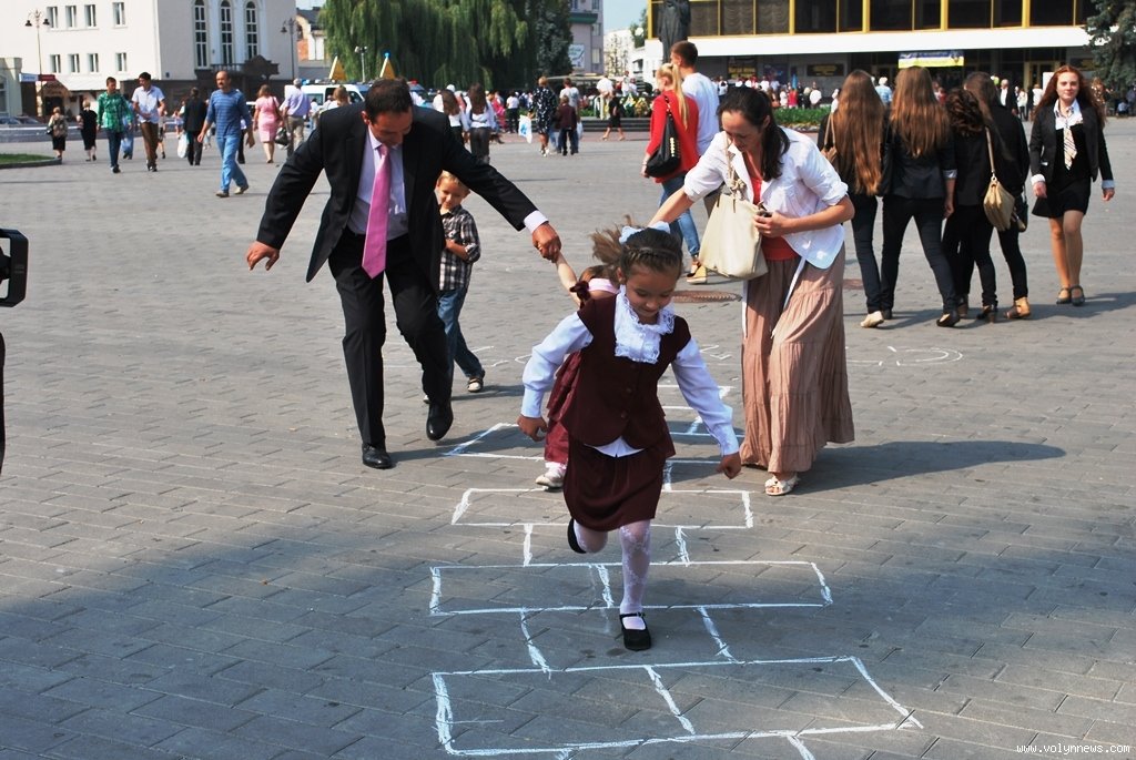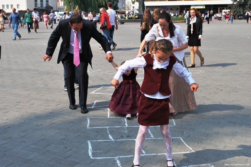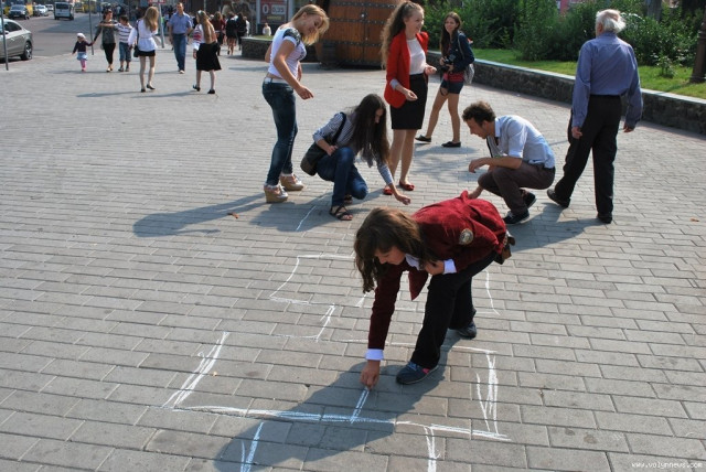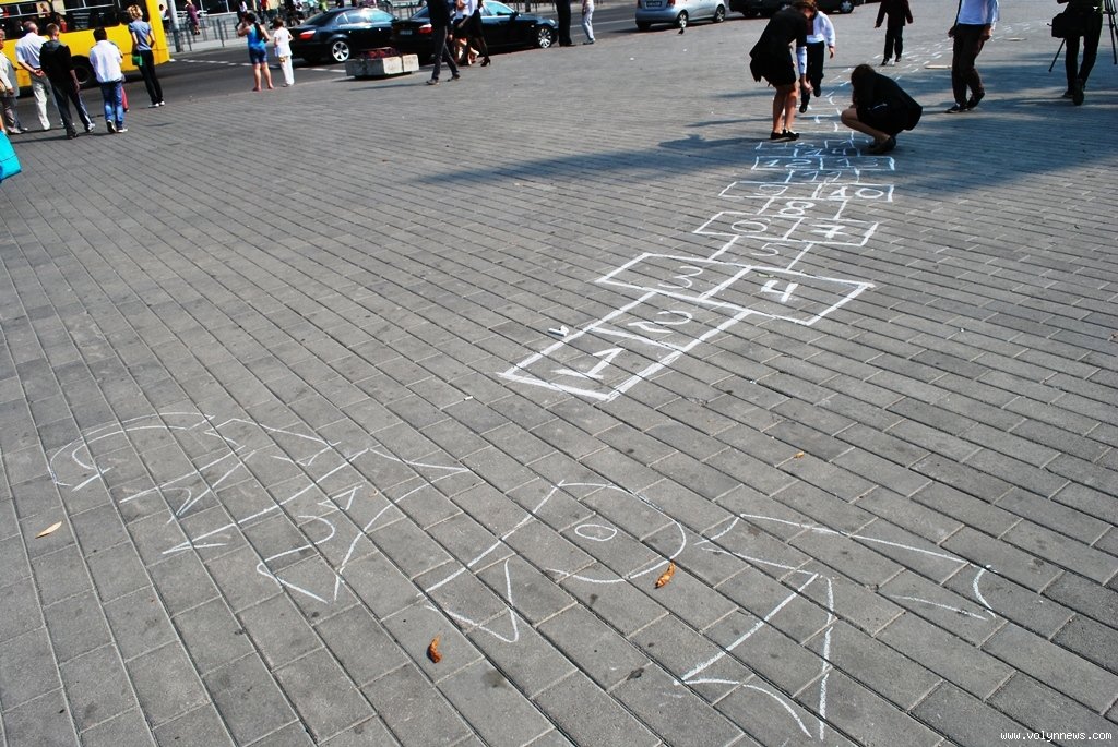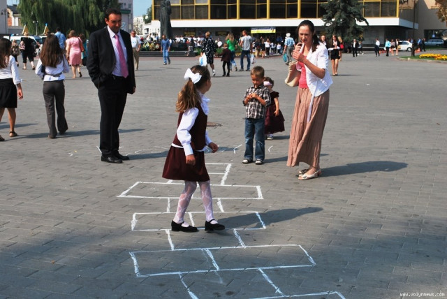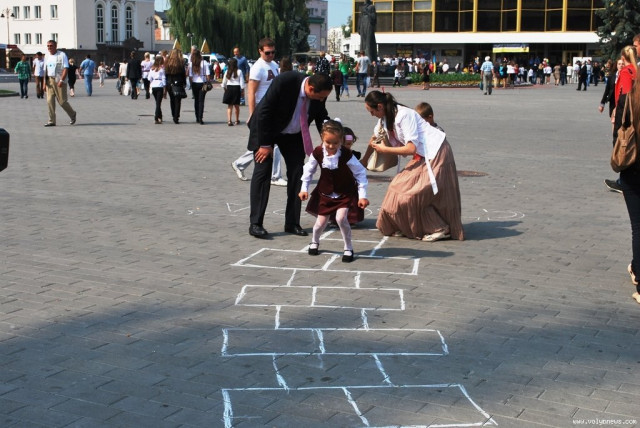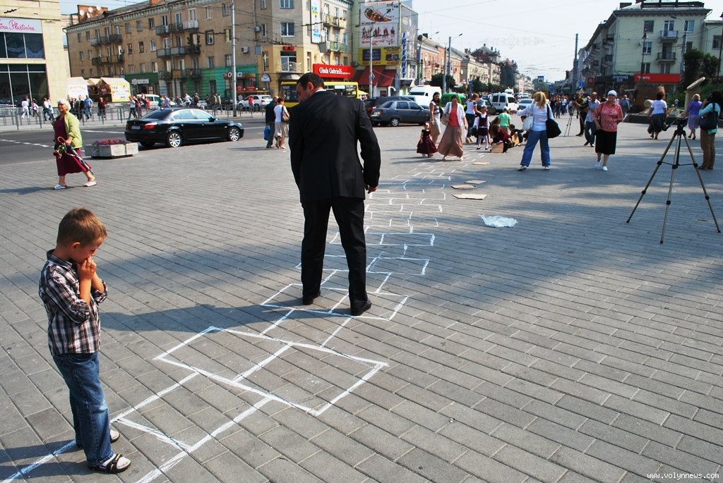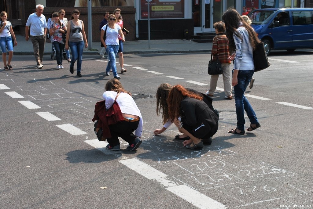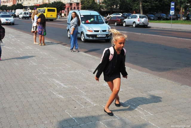 «Класики» довжиною понад 800 метрів намалювали 1 вересня на асфальті у Луцьку. Дитяча забавка стартувала на Театральному майдані.