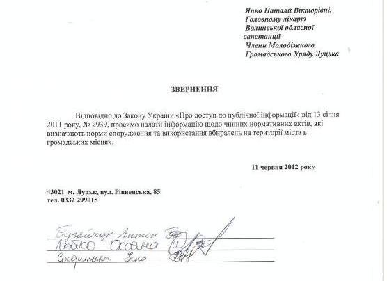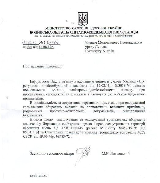 ГУЛ звернувся із запитом до Волинської обласної санітарно-епідеміологічної станції з проханням надати інформацію щодо чинних норм функціонування громадських вбиралень. На основі отриманої від СЕС відповіді Романюка попросили розглянути питання подолання проблеми громадських вбиралень в Луцьку.