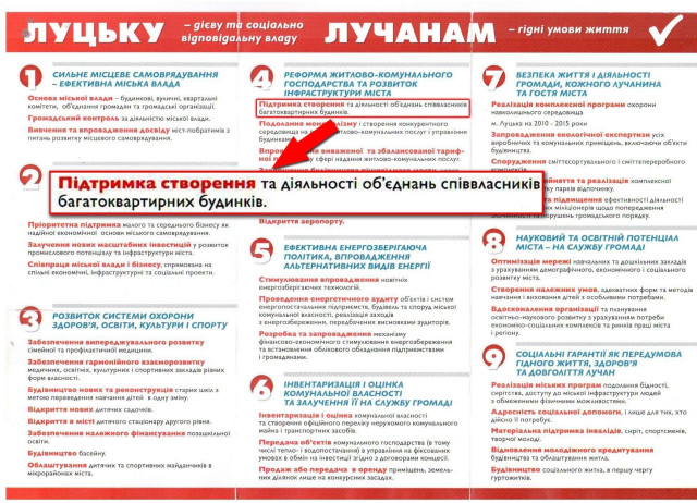 У Розділі 4, який стосується реформи ЖКГ, передвиборчої програми кандидата на посаду луцького міського голови Миколи Романюка вказано, що він обіцяє «підтримку створення та діяльності об’єднань співвласників багатоквартирних будинків».