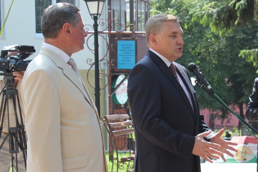 Символічні стрічки під час відкриття знаку партнерських міст перерізали міський голова Микола Романюк, президент міста Білосток Тадеуш Трусколяскі.