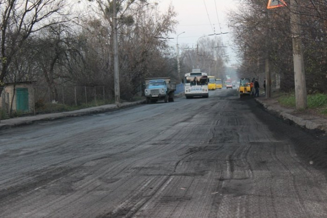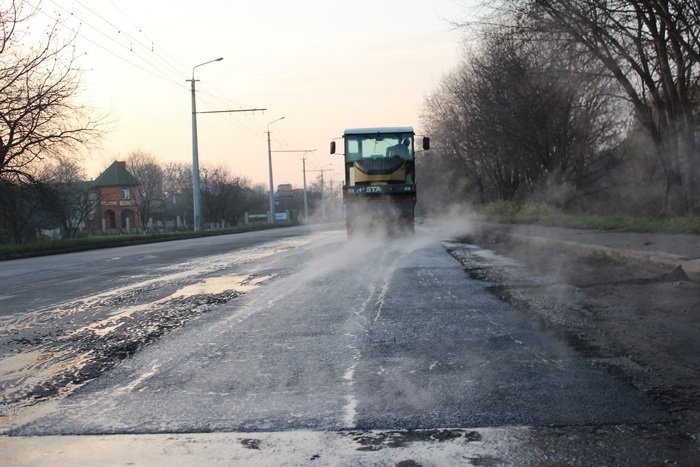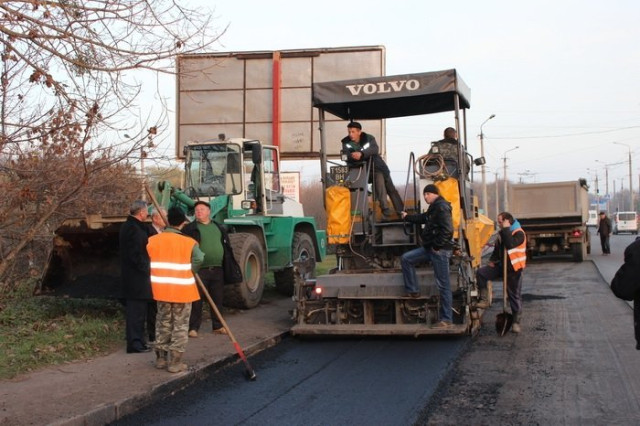 Ямковий ремонт триває і на вулиці Боженка. Нині робітники вирізають карти на дорозі та вкладають їх асфальтом.