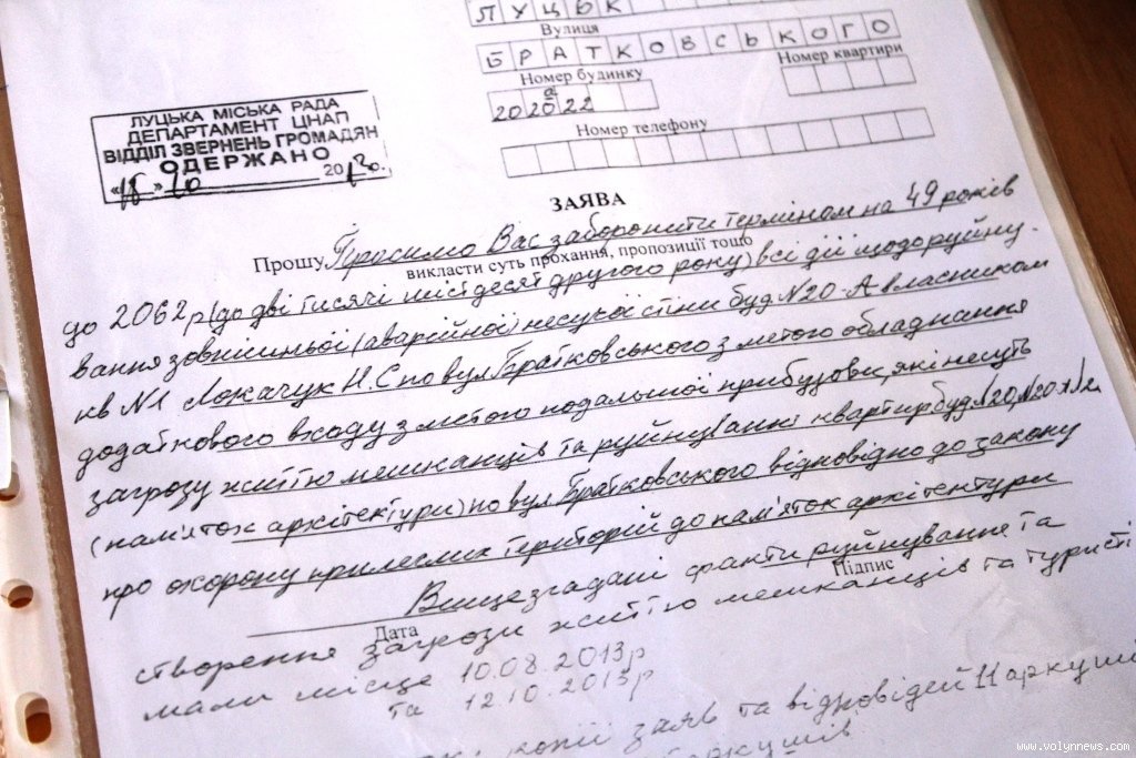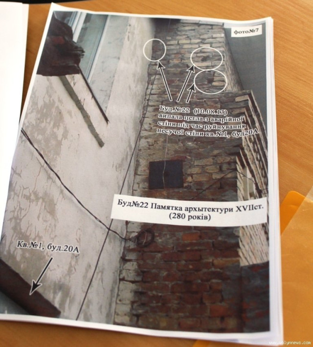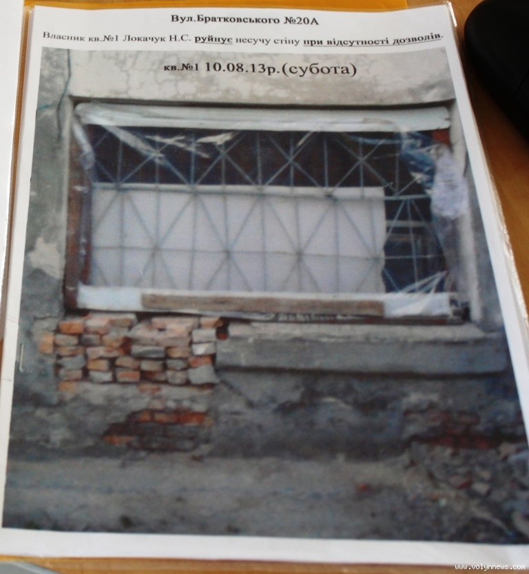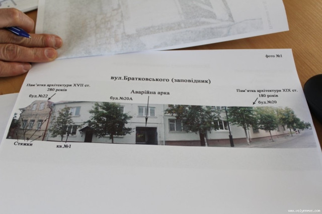 З її слів, йдеться про три будинки у історико-архітектурному заповіднику «Старий Луцьк» на вулиці Братковського, два з яких є пам’ятками архітектури - одному - 280, іншому - 180 років. Будівлі перебувають у аварійному стані. В будинку № 20а, який не є пам’яткою архітектури, одна з мешканок розпочала пробивати несучу стіну з метою зробити вікно із виходом у внутрішній двір, що призвело до утворення нових тріщин та збільшення старих. Центр биття несучої стіни розташований на відстані двох метрів від стіни будинку майже трьохсотрічного віку, яка розкололася на три частини, та в шести метрах від аварійної арки, яка стоїть на підпорах та, зі слів мешканки, поступово провалюється.