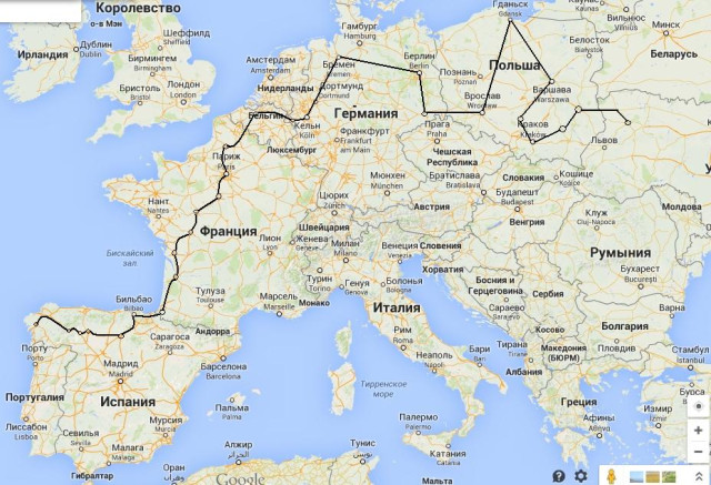 Маршрут експедиції пролягатиме наступними країнами: Польща, Німеччина, Бельгія, Нідерланди, Люксембург, Франція, Іспанія, Португалія, Італія, Монако, Сан-Марино, Ватикан, Швейцарія, Ліхтенштейн, Австрія, Чехія, Словаччина та інші.
