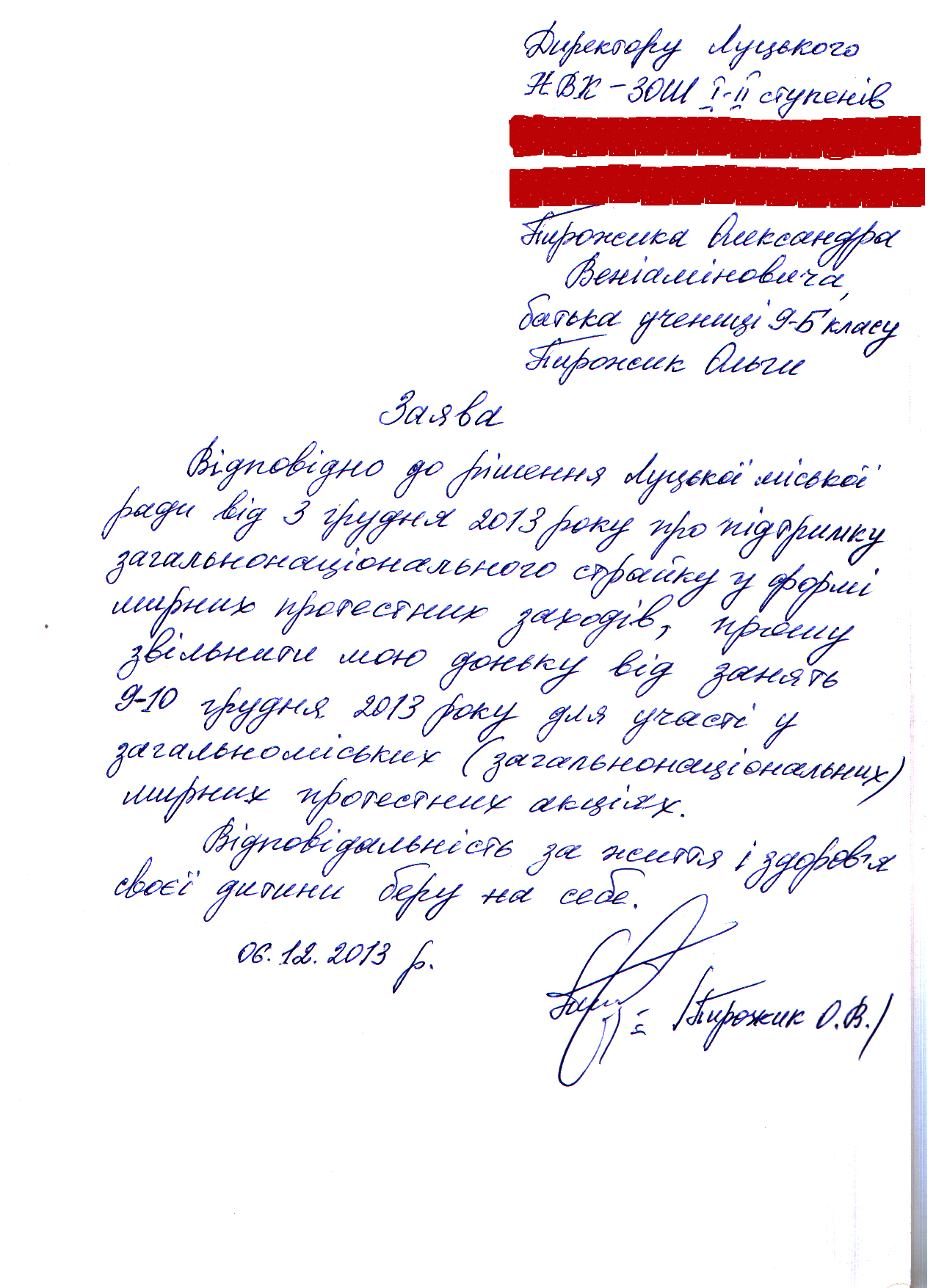 «Моя донька, як і її ровесники, живе Євромайданом і рветься на Майдан. 4 грудня під час позачергової сесії обласної ради вона з ровесниками була на Київському майдані в Луцьку, вмовивши мене написати до керівництва школи заяву, щоб задля цього її звільнили від занять. Звертаюся до всіх свідомих батьків луцьких старшокласників! Не забороняйте своїм дітям йти виборювати їхнє ж майбутнє! Пишіть відповідні заяви на ім'я директорів шкіл, нехай на луцьких майданах наші діти будуть поруч із нами. Нехай вони відчують європейський дух майданів, щоб їхній світогляд сформувався повноцінним - таким, який ніколи не сприйме комплексу раба... Тим більше, що в нас із вами є на це законне рішення Луцької міської ради від 3 грудня 2013 року щодо підтримки загальнонаціонального страйку. Скористайтеся цим, пишучи відповідні заяви директорам шкіл. Щоправда, відповідальність за життя та здоров'я наших дітей нам доведеться взяти на себе. Бо столичні «правоохоронці» вже показали, що вони можуть не охороняти, а до крові бити наших дітей!! Я справді вірю начальнику обласної міліції генералу Олександру Терещуку, що він не допустить кровопролиття на Волині, я мав із ним з цього приводу не одну розмову. Але я НЕ ВІРЮ СТОЛИЧНИМ МЄНТАМ, тому не можу дозволити собі закликати Вас брати з собою своїх дітей на столичний Євромайдан. Водночас закликаю Вас вже у понеділок-вівторок дозволити нашим старшокласникам вийти з нами на луцькі майдани. Будьмо разом!», - йдеться у повідомленні.