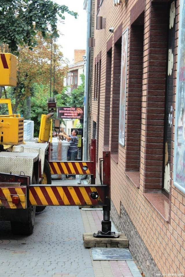 Упродовж двох годин на вулиці Винниченка, біля ТЦ «Буратіно» стоїть підйомний кран. Він займає усю площу тротуару, тож пішоходам доводиться обходити його проїжджою частиною. Біля місця проведення «таємних робіт» немає жодних знаків попередження і огорож.