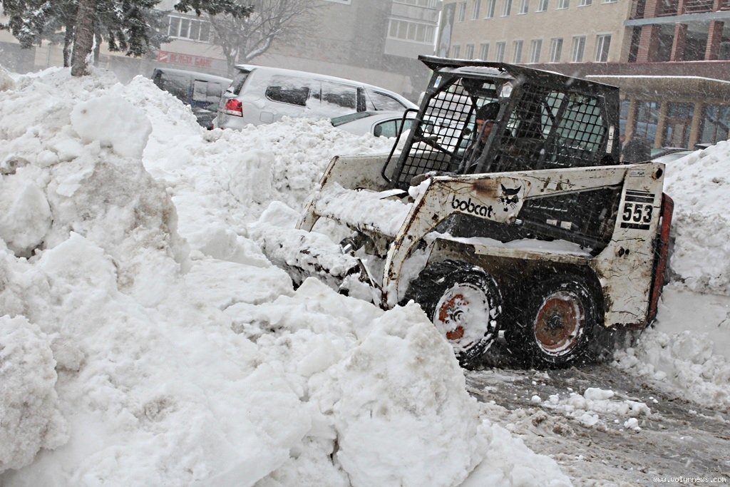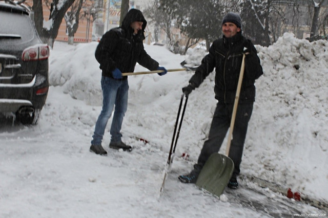 Зокрема територію біля готелю «Україна» та приміщення УМВС України в області розчищають сніг за допомогою тракторів та лопат.