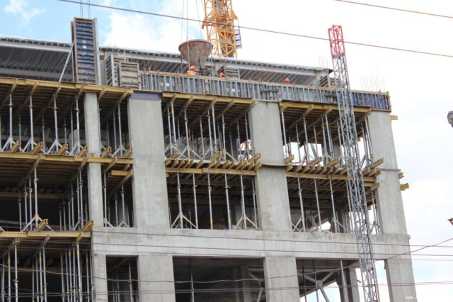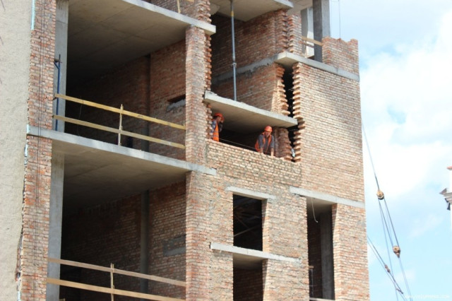 Нині біля ЦУМ-у кипить робота. Будівельники працюють у дві зміни.