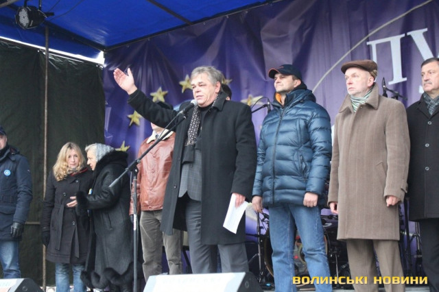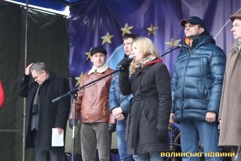 «Ми прочитали цікаву новину, що місто Калуш оголосили містом без Януковича і там міська рада закликала усіх знімати портрети Президента Януковича з державних установ. Я дуже хочу, щоб сьогодні Луцьк було оголошено теж містом без Януковича! Тому давайте всі з усіх державних установ, шкіл знімати його портрети, тому що він не наш Президент. Луцьк – місто без Януковича!», - закликала лучан координатор луцького Євромайдану Майя Москвич.