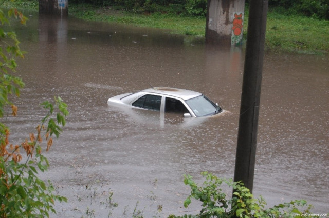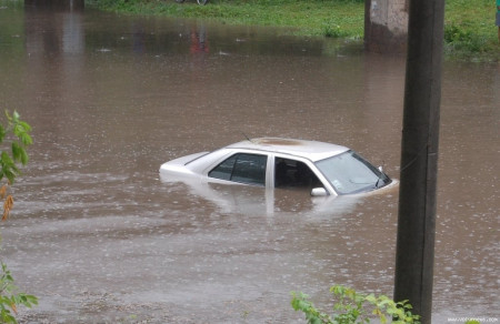 На вулиці Карпенка-Карого у калюжі, яка утворилася після сьогоднішньої зливи, «потонула» машина.