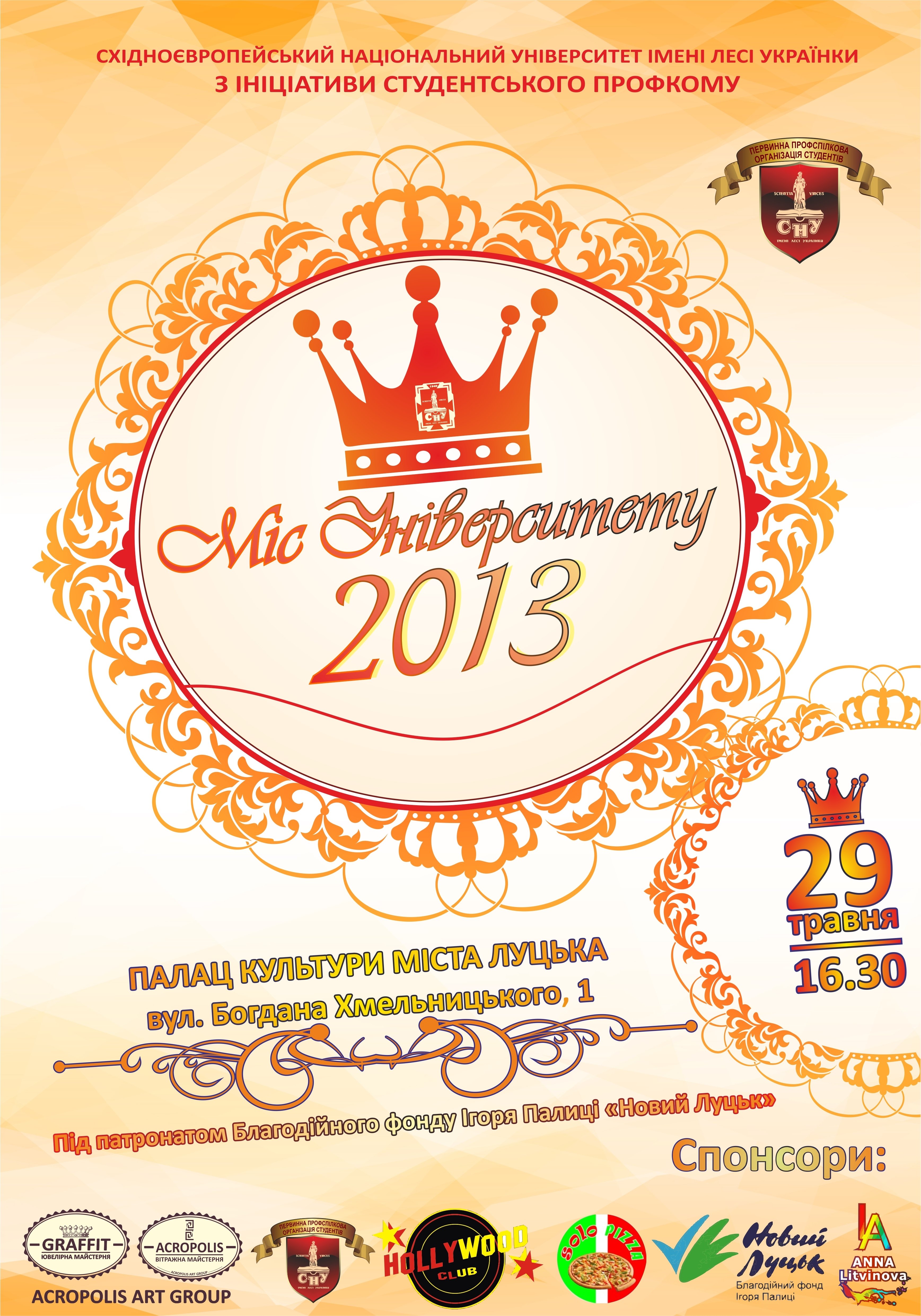 Заключний етап конкурсу «Міс університету – 2013» відбудеться 29 травня о 16:30 у приміщенні Палацу культури Луцька. Тут обиратимуть найкрасивішу студентку Східноєвропейського національного університету імені Лесі Українки.