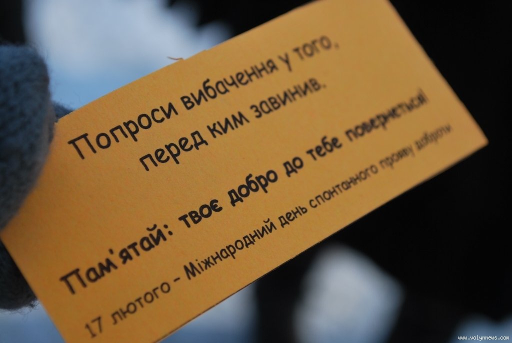 Таке дійство у облцентрі відбувається вже вдруге. «Добро важко роздати, воно весь час повертається», ‒ під таким гаслом відбувається акція цьогоріч. Так, волонтери-добродії роздавали спеціальні картки із зобов'язаннями на день.
