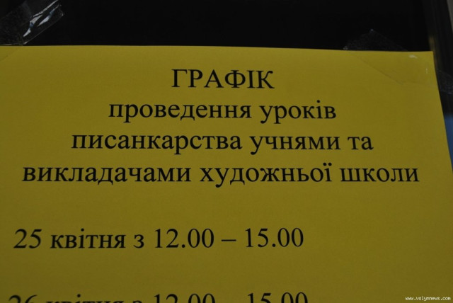 Організатори розповіли, що після виставки писанок учнів Луцької художньої школи впродовж 24–30 травня триватимуть майстер-класи, які проводитимуть учні та викладачі цього ж навчального закладу.