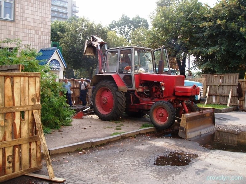 Фото: Спочатку приїхав трактор «Луцьктепла». Він намірився викопати яму, щоб перекласти трубу теплоцентралі з місця майбутнього будівництва.