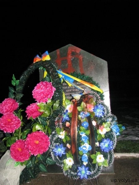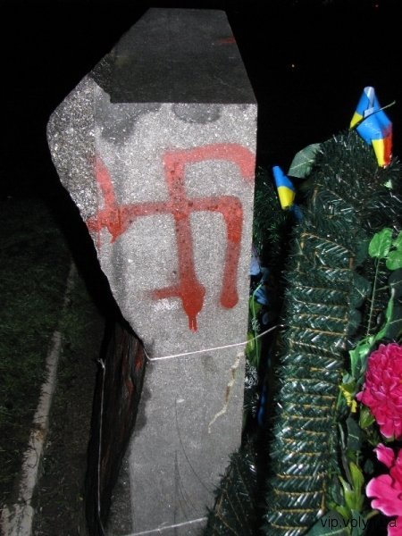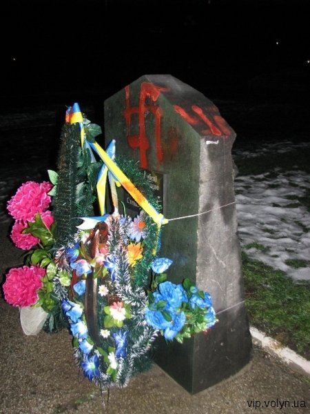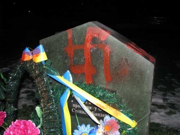 У Луцьку невідомі 10 січня на камені, що встановлений на місці, де має стояти пам’ятник провідникові ОУН Степану Бандері, намалювали червоною фарбою нацистську свастику.