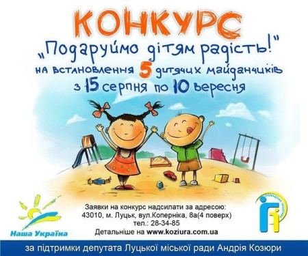 Луцька міська організація партії «Наша Україна» та Громадська організація «Громадська ініціатива» оголосили міський конкурс на встановлення п’яти дитячих майданчиків прибудинкового формату.