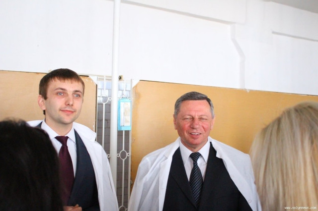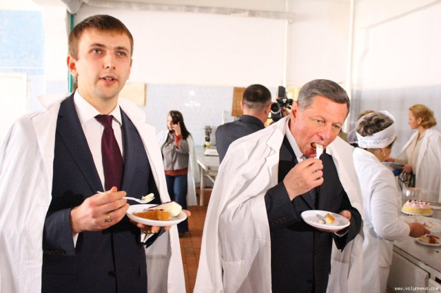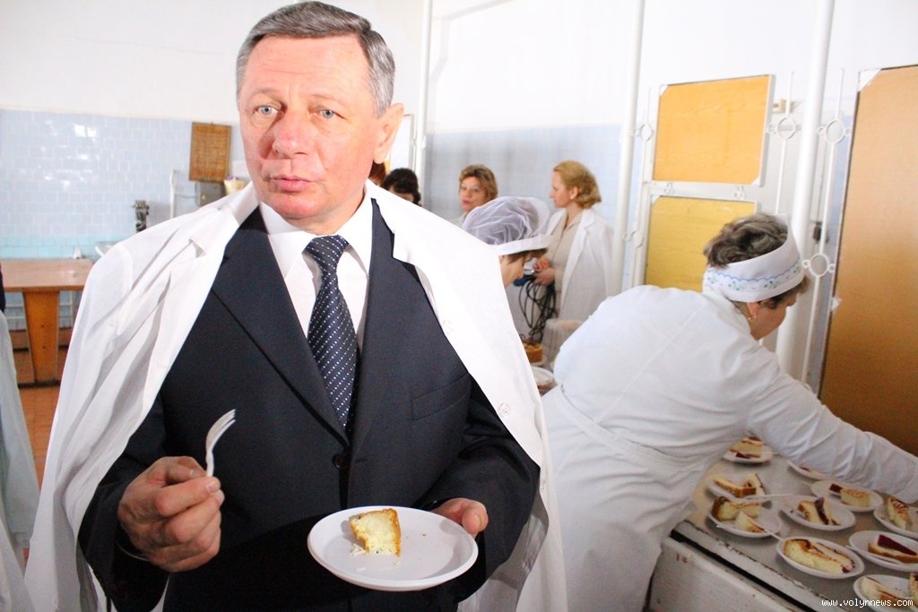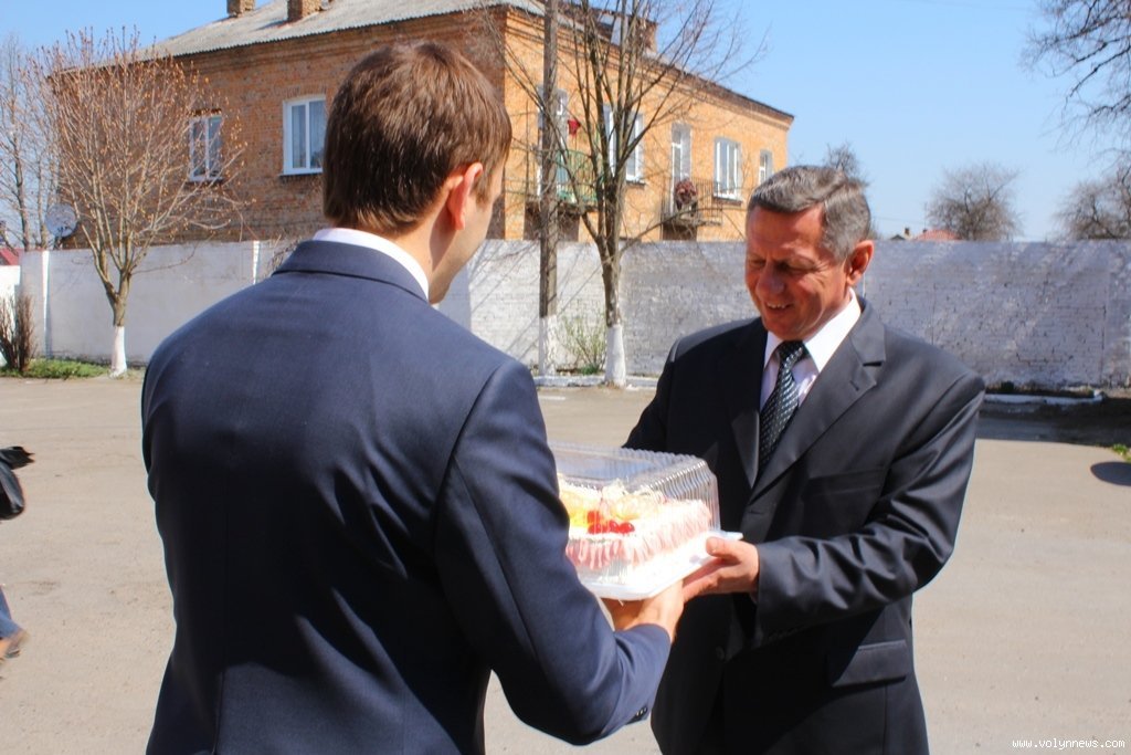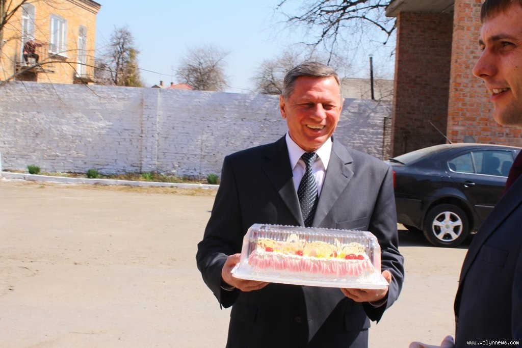 Насамкінець, Олександр Ляцевич вручив Миколі Романюку величезний торт, який мер Луцька передав територіальному центру соціального обслуговування міста Луцька.