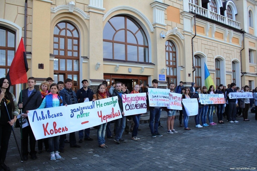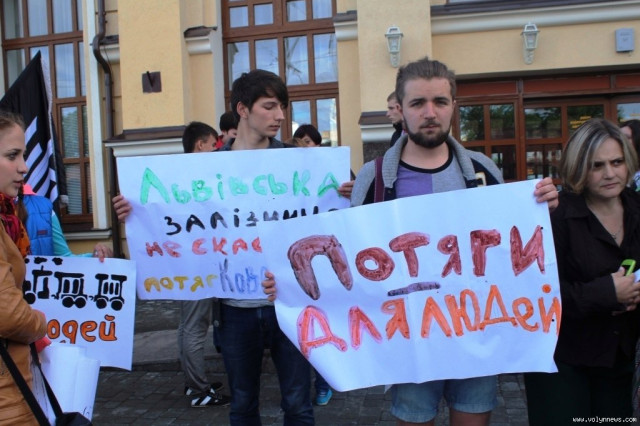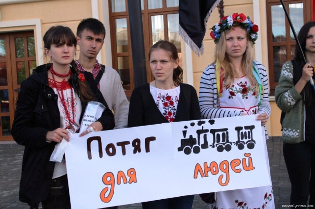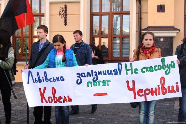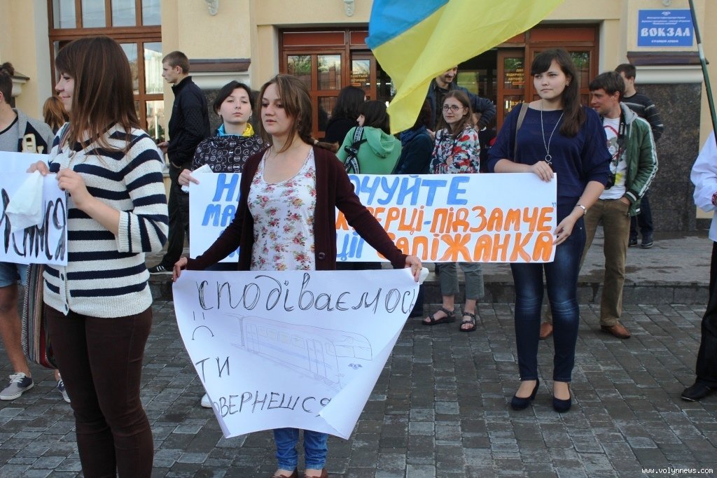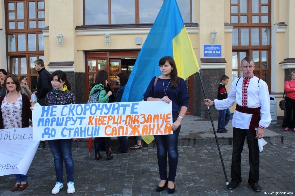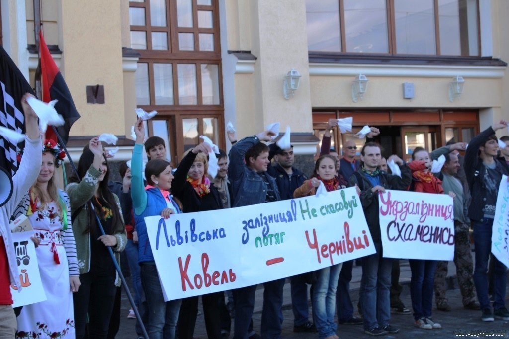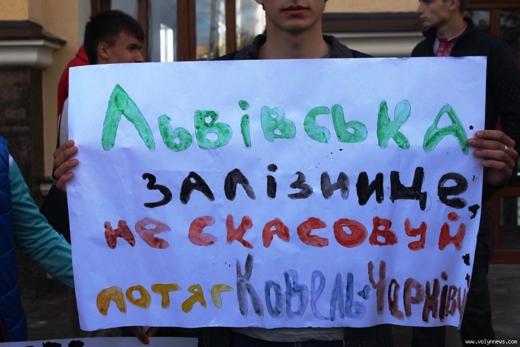 Проти відміни потяга «Ковель-Чернівці» зібралося на залізничному вокзалі Луцька декілька десятків молодих людей. За допомогою гасел та плакатів вони висловили протест у неділю, 26-ого травня.