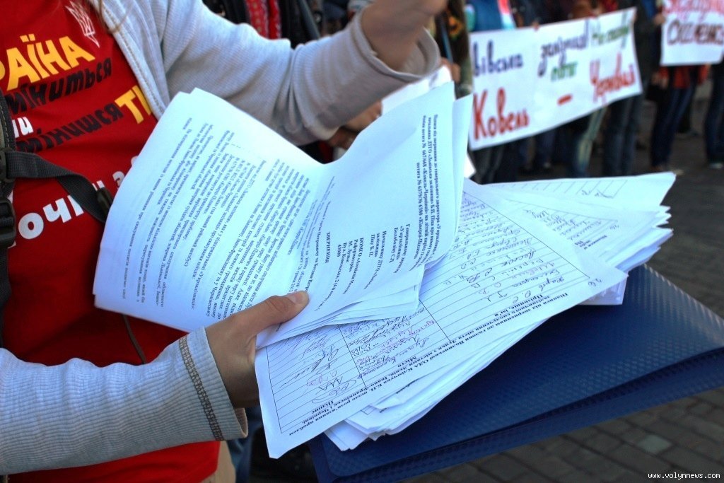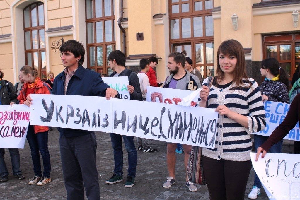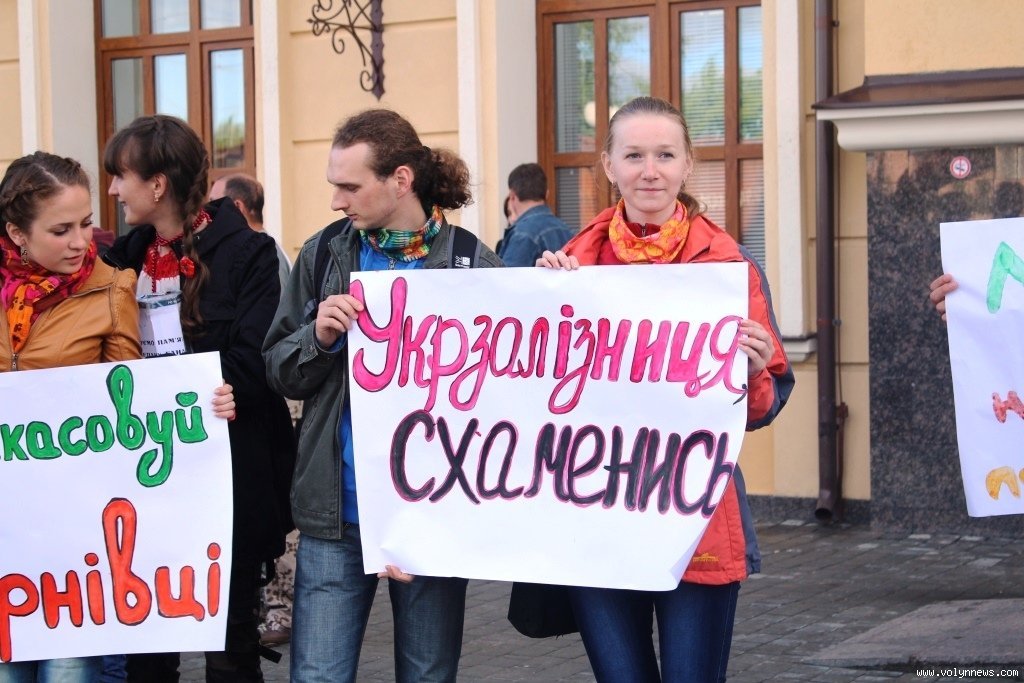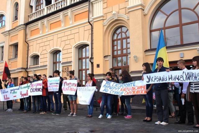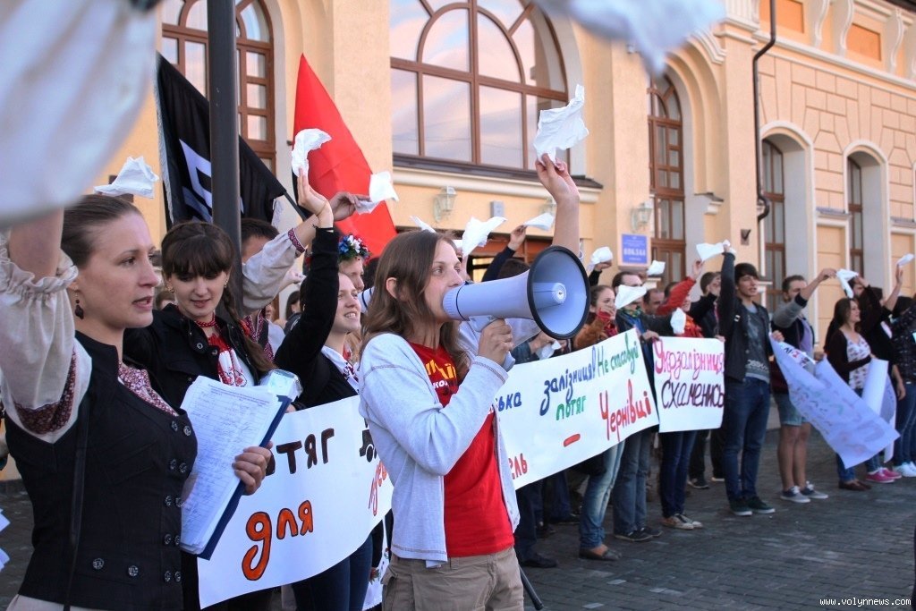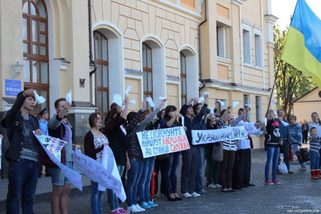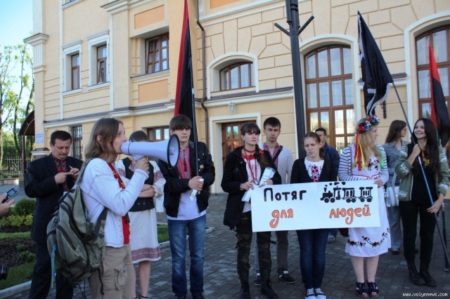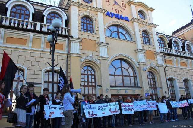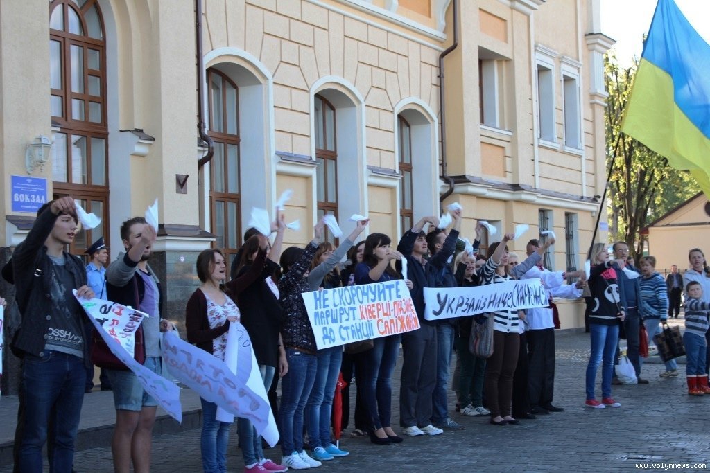 Проти відміни потяга «Ковель-Чернівці» зібралося на залізничному вокзалі Луцька декілька десятків молодих людей. За допомогою гасел та плакатів вони висловили протест у неділю, 26-ого травня.