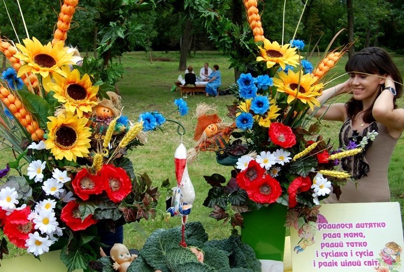 Окрім квітів, для виготовлення композицій використовували фрукти, овочі, ягоди, деревину, траву, лозу, сіно тощо.