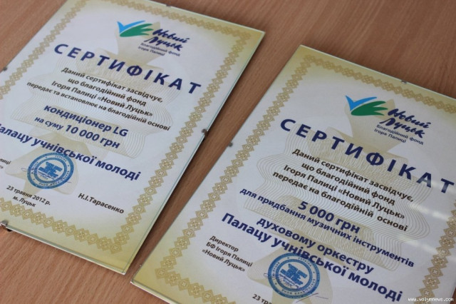 Але у таку скрутну мить руку допомоги простягнули меценати. Так, за підтримки благодійного фонду Ігоря Палиці «Новий Луцьк» у закладі буде встановлено дороговартісний кондиціонер. Окрім того, фонд передав 5 тисяч гривень на придбання музичних інструментів для духового оркестру Палацу учнівської молоді.