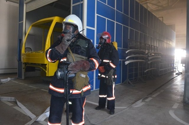Для гасіння пожежі та пошуку потерпілих рятувальники працювали всередині цеху в складі 3-х ланок газодимозахисної служби, а для гасіння умовного вогню на даху фарбувального цеху подали потужні водяні струмені за допомоги колінчатого підйомника.