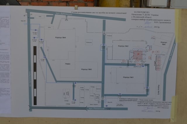 Згідно з задумом, пожежа трапилась на одному з найбільш небезпечних виробництв підприємства – у фарбувальному цеху. Першими до боротьби з умовним лихом приступили пожежна команда та добровільна пожежна дружина заводу, а за декілька хвилин до місця події прибули чергові варти рятувальників ДСНС області з усіх пожежно-рятувальних підрозділів міста Луцька.