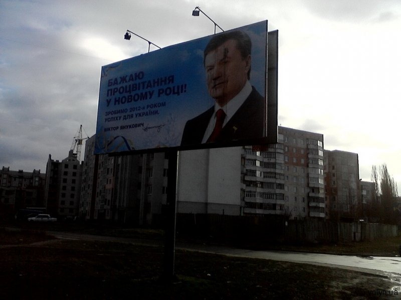 Білборди із привітанням Президента України Віктора Януковича у Луцьку закидали чорною фарбою. Чорні плями на обличчі глави держави у обласному центрі з’явилися 13 січня.