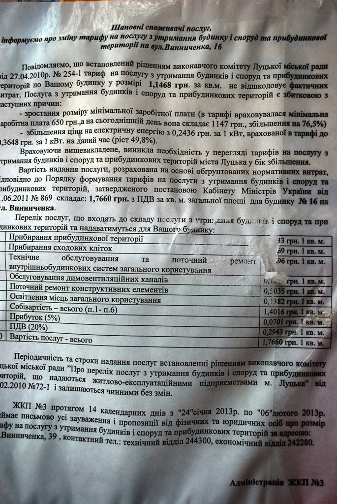Згідно з інформаційними листами розташованими на під’їздах, лучани можуть надсилати свої зауваження та пропозиції щодо збільшення тарифів до ЖКП за яким «закріплений» будинок до 6 лютого.