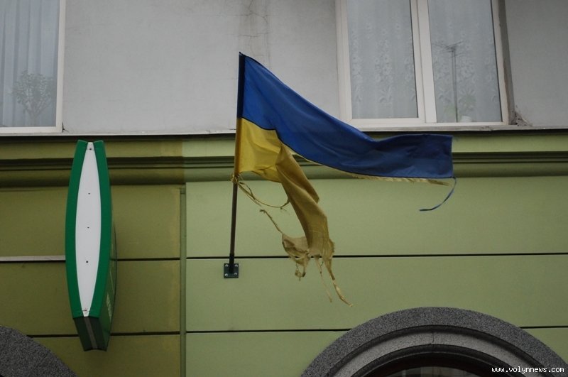 На одному з будинків на проспекті Волі в центрі Луцька «красується» національний стяг, який більше схожий на стару ганчірку.