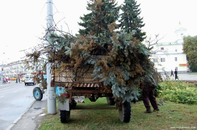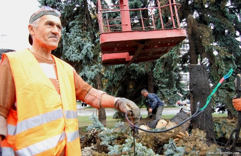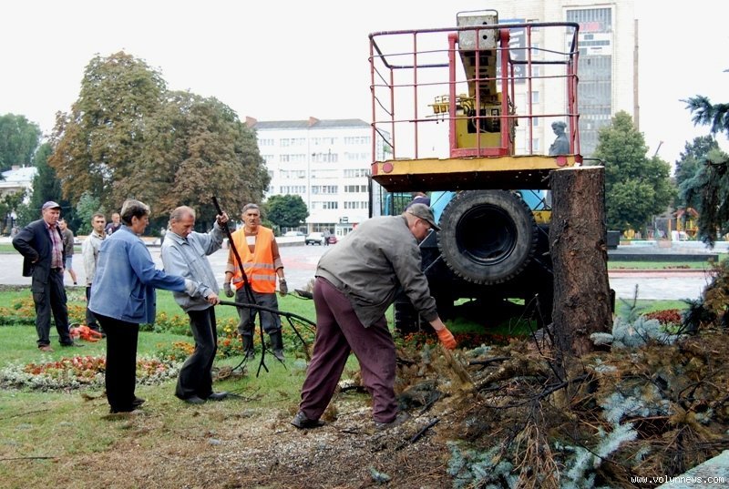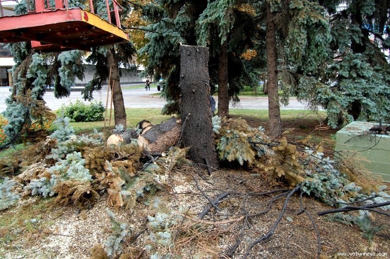 В центрі Луцька зрізали обгорілу ялинку. ФОТО