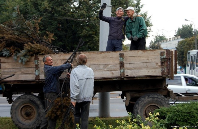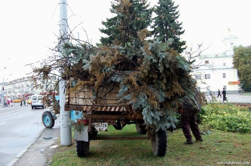 Близько десяти людей зібрали деревину та гілля на причіп трактора та вивезли з центральної площі Луцька.
