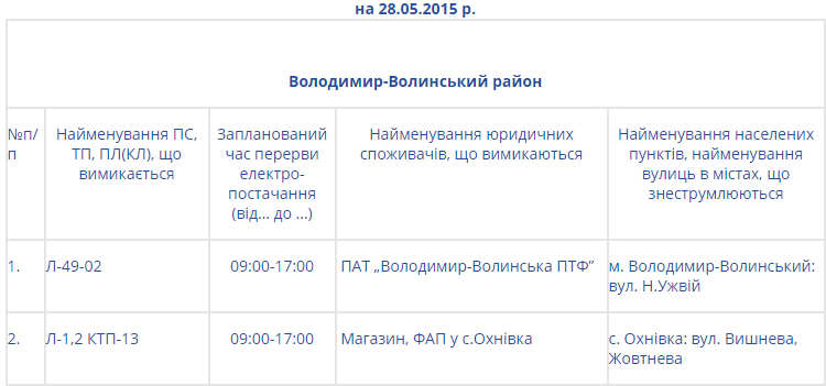 ПАТ «Волиньобленерго» інформує про планові відключення електроенергії на Волині завтра, 28 травня.