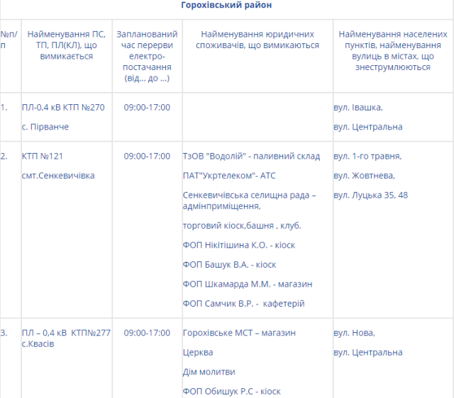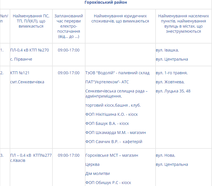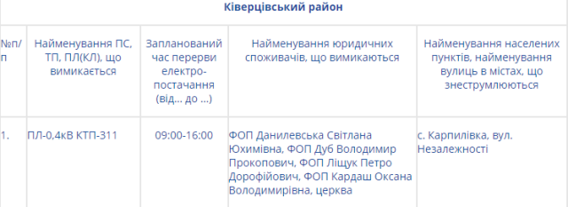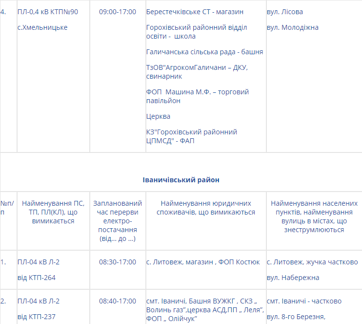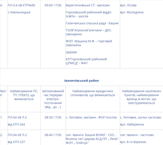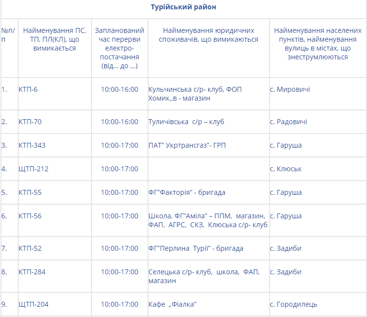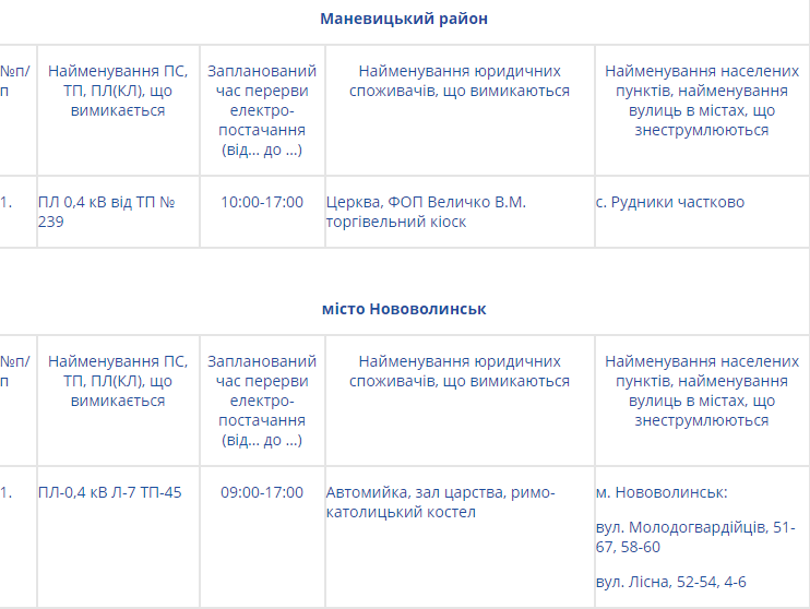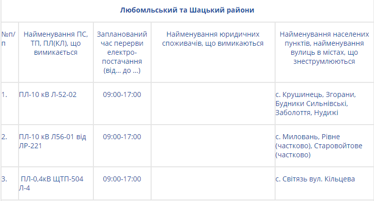 Натомість на Волині електроенергії не буде у таких районах: Володимир-Волинському, Горохівському, Іваничівському, Ківерцівському, Любомльському та Шацькому, Маневицькому, Турійському та у Нововолинську.