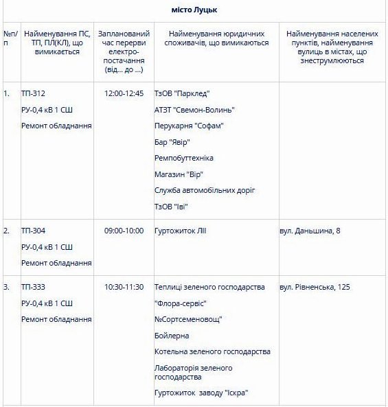Згідно з графіком, у Луцьку без світла залишаться наступні об'єкти: