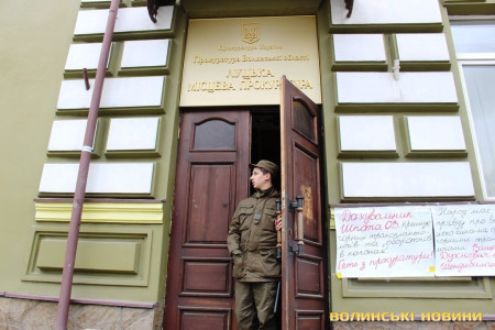 Волиняни прийшли під обласну прокуратуру з плакатими в руках, на який йдеться про злочинні дії працівників правоохоронної, судової гілок влади та медиків. Люди говорять про правопорушення, які вчинили по відношенню до них й інших краян та закликають громадськість звернути на це увагу, а прокурорів просять провести чесне розслідування.