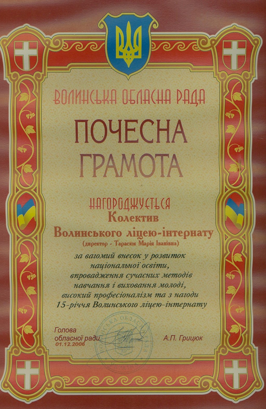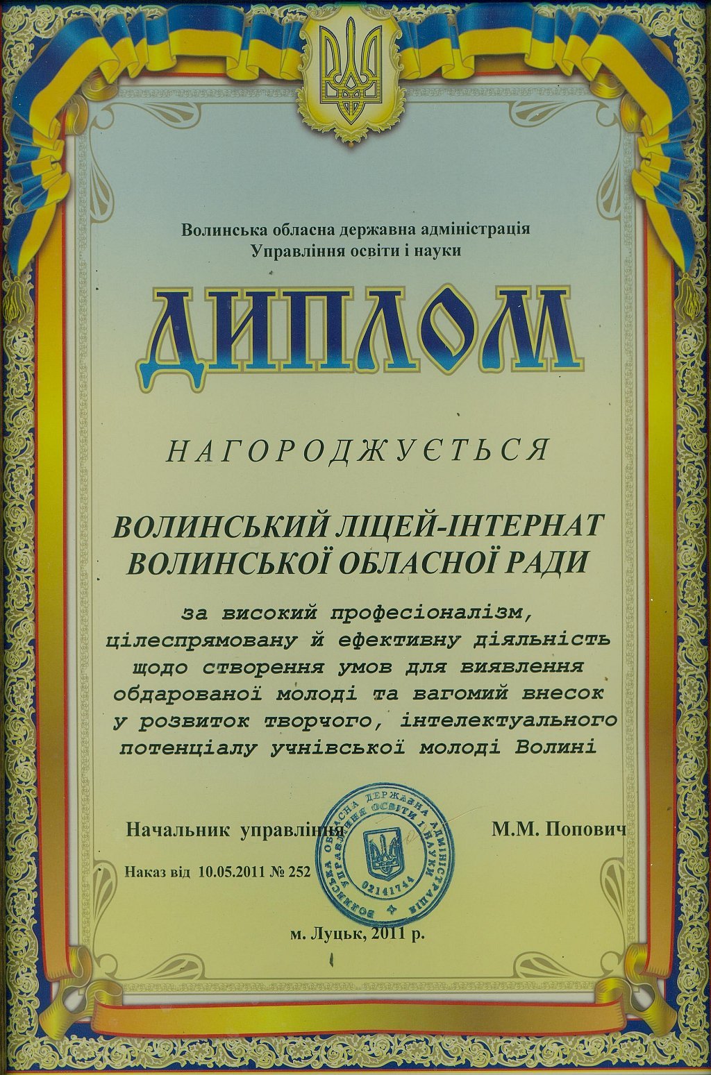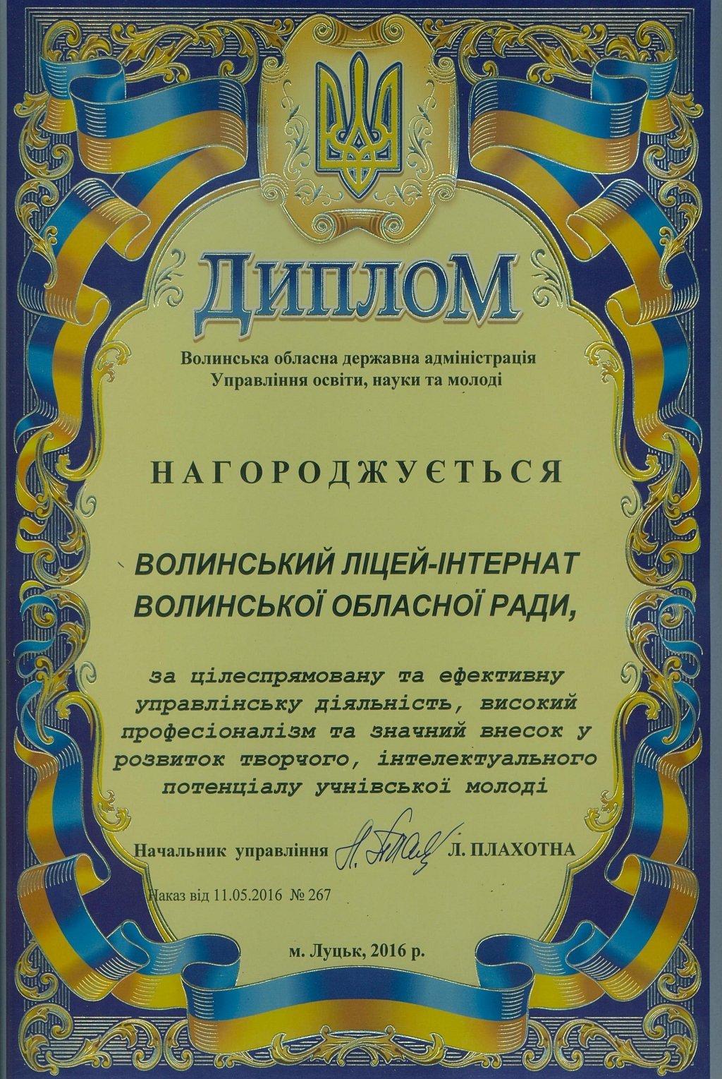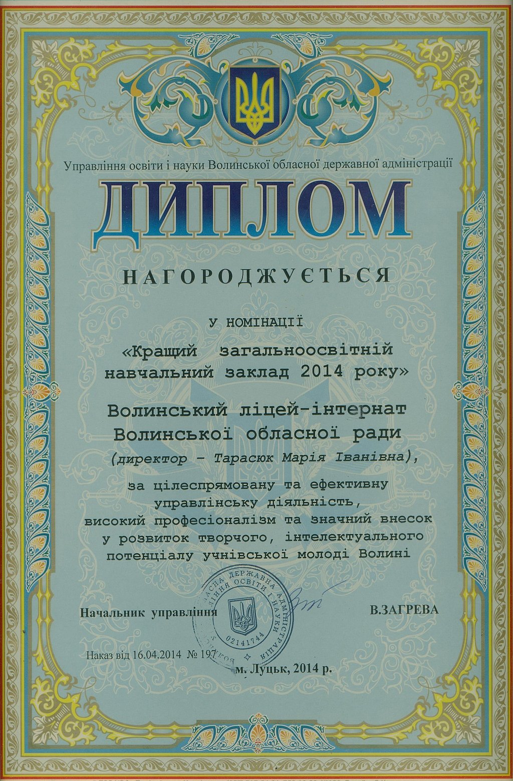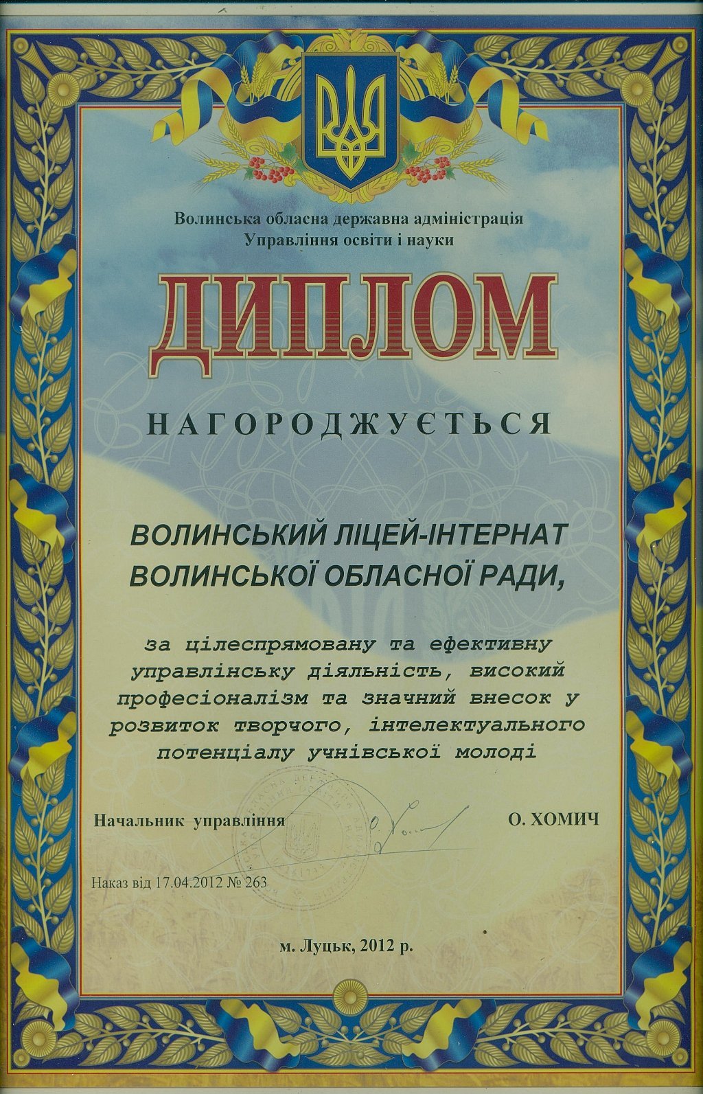«Протягом 12-ти років ліцей-інтернат отримує відзнаку кращого загальноосвітнього навчального закладу на Волині за результатами участі ліцеїстів у всеукраїнських олімпіадах, конкурсах-захистах науково-дослідницьких робіт МАН та предметних турнірах. У цьому наші учні тримають першість вже багато років поспіль.