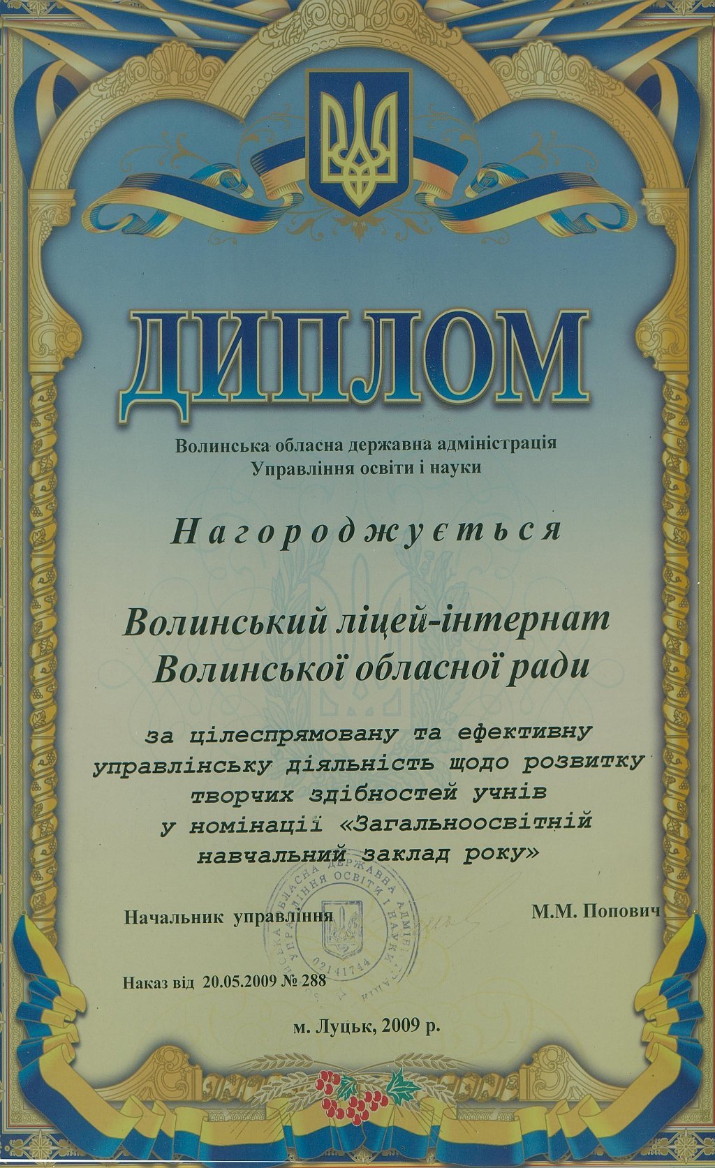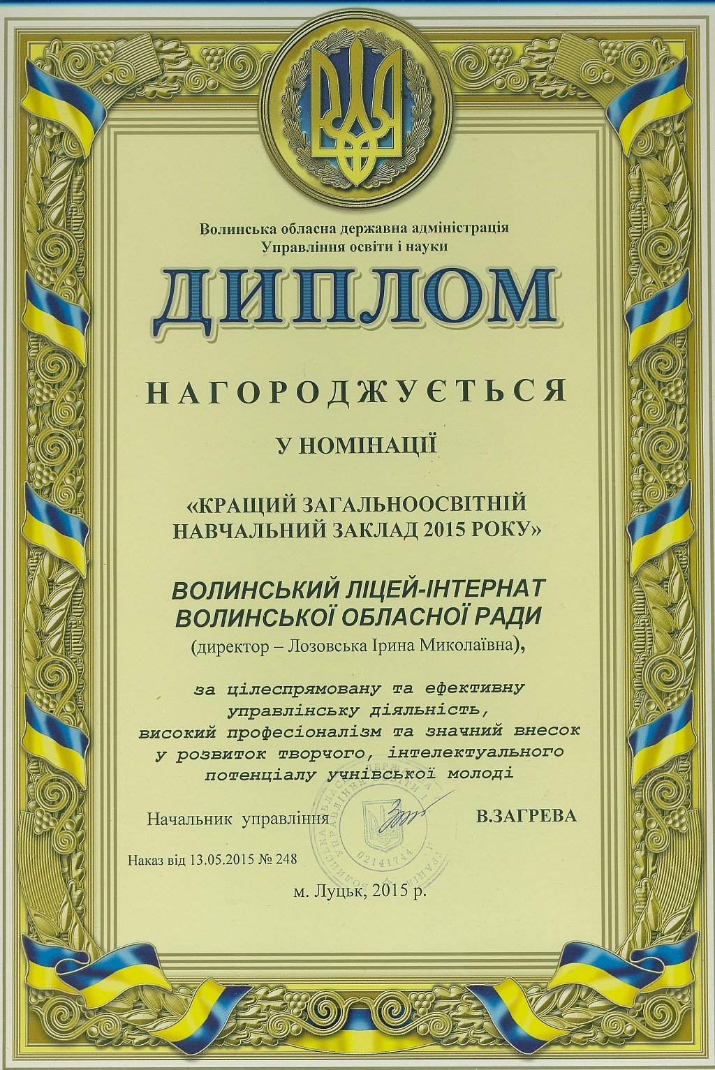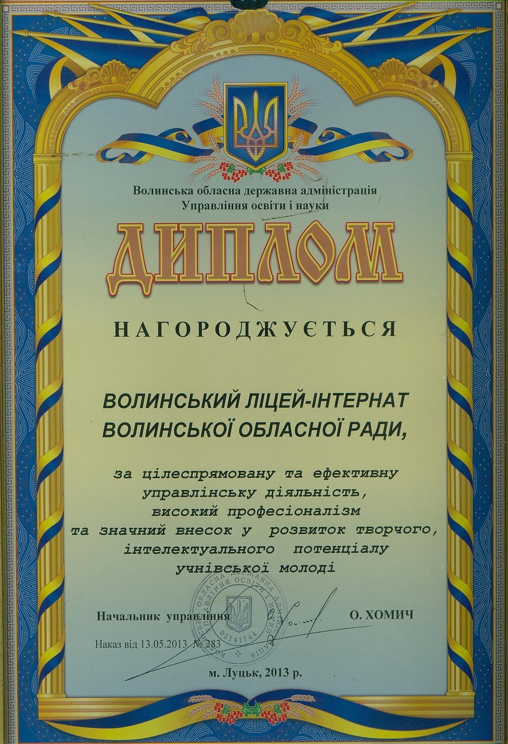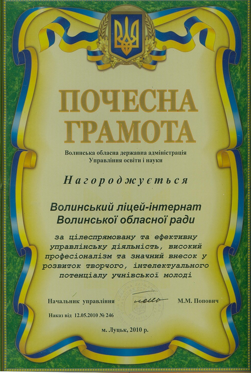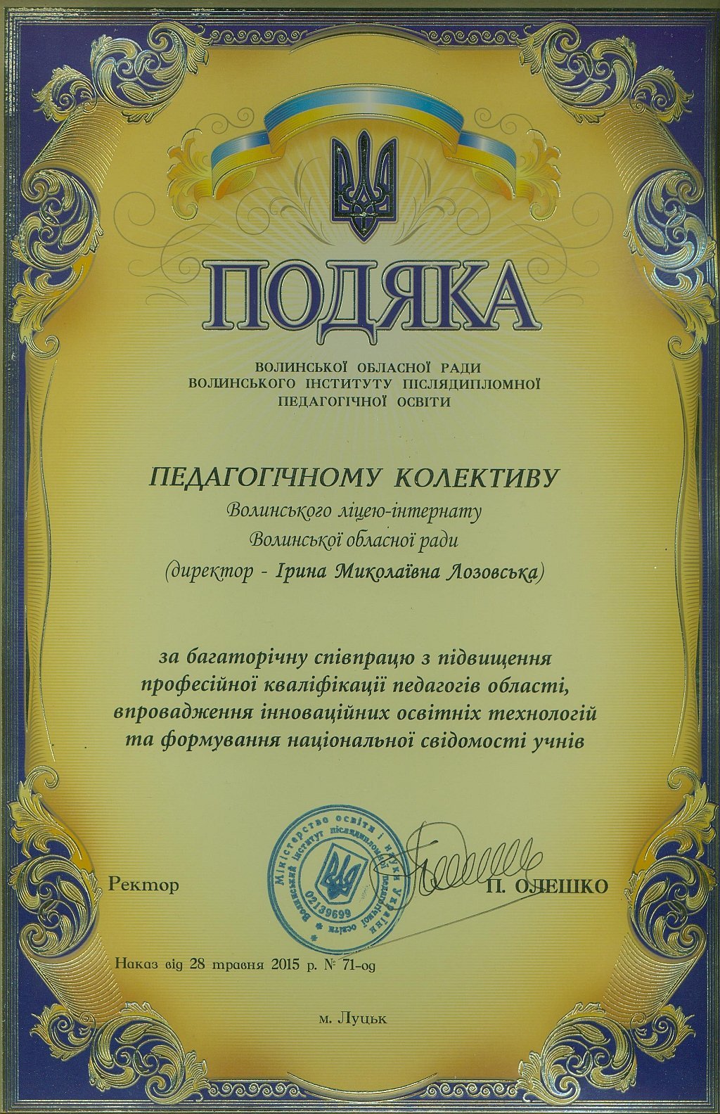 «Протягом 12-ти років ліцей-інтернат отримує відзнаку кращого загальноосвітнього навчального закладу на Волині за результатами участі ліцеїстів у всеукраїнських олімпіадах, конкурсах-захистах науково-дослідницьких робіт МАН та предметних турнірах. У цьому наші учні тримають першість вже багато років поспіль.