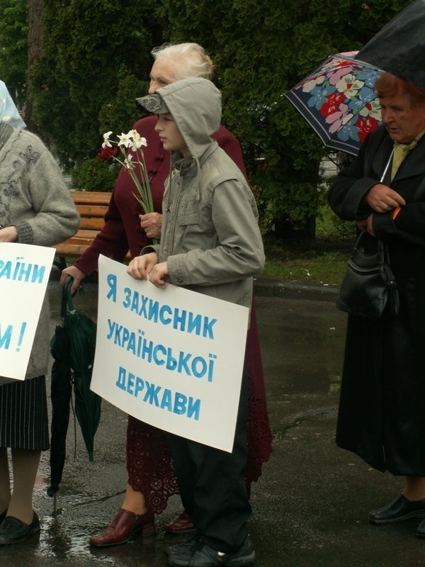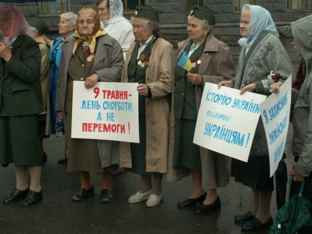 Вояки УПА стояли із плакатами «9 Травня день скорботи, а не перемоги», «Історію України писати українцям!», «Україна не колонія Росії», «Я захисник української держави».