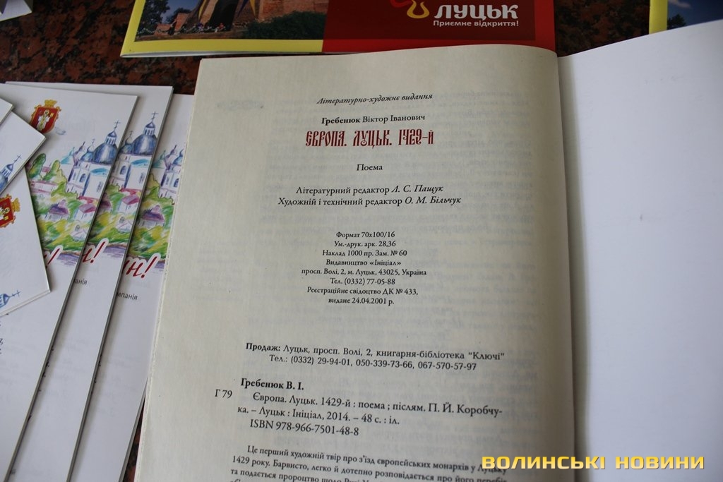 У Луцьку презентували книгу Віктора Гребенюка «Європа. Луцьк.1429-й». Захід відбувся у рамках відкриття туристичного сезону в обласному центрі сьогодні, 10 травня. Книга, яку презентували сьогодні – поема про перший з’їзд європейських монархів, який відбувся у Луцьку 1429 року. До слова, цього річ у місті відзначатимуть 585 річницю цього з’їзду.