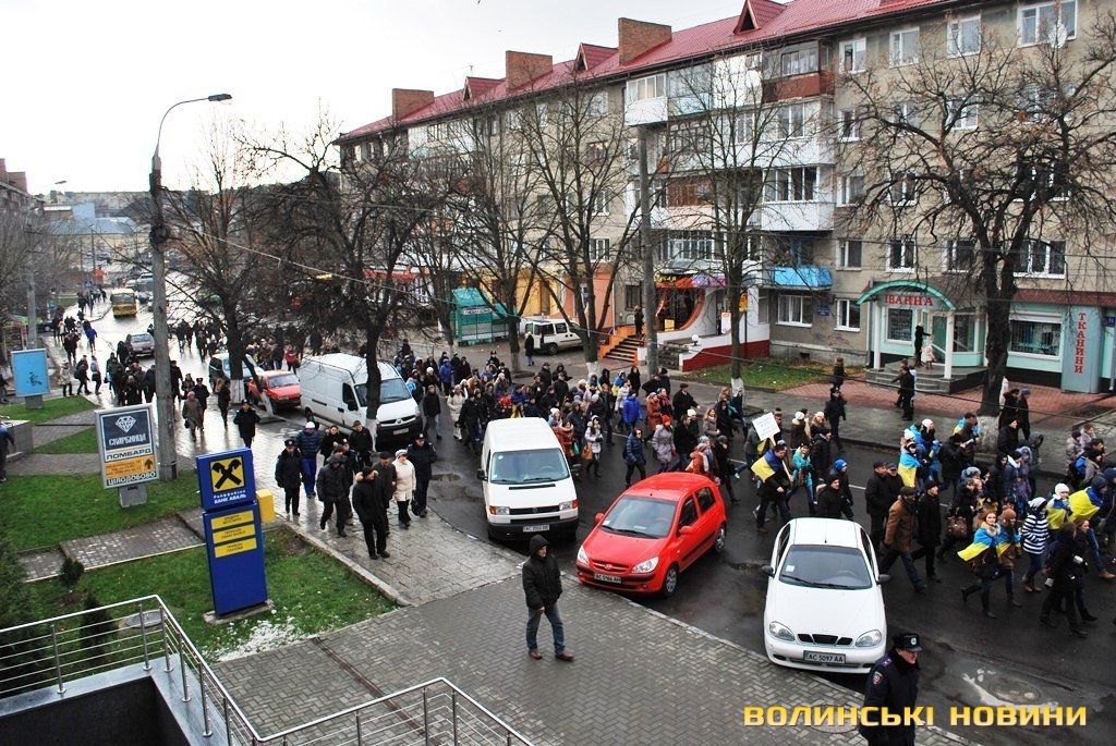 12:05: Активісти йдуть до начальника Управління СБУ у Волинській області генерал-майора Володимира Мельниковича, зупиняються поруч з СНУ імені Лесі Українки, закликають студентів долучитися до мітингувальників. Щоправда, на заклик так ніхто й не вийшов.
